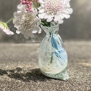 口のところをキュッと絞ったきんちゃくの様な形のガラスの花瓶です。