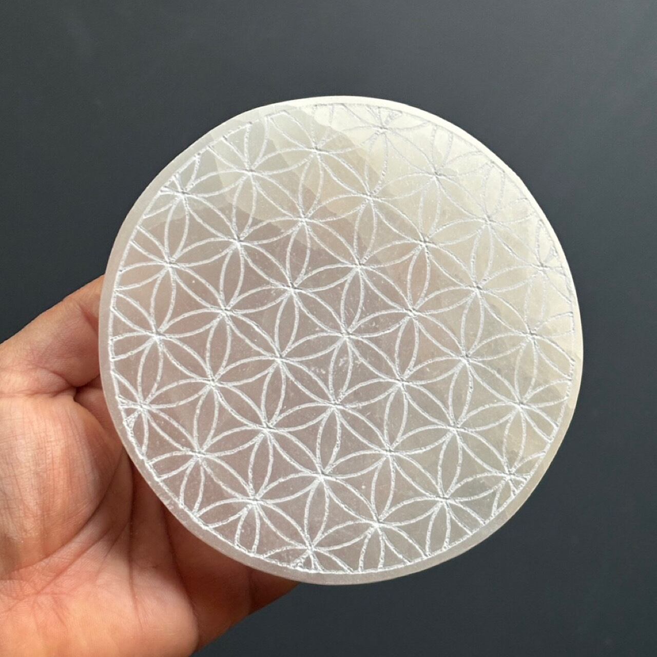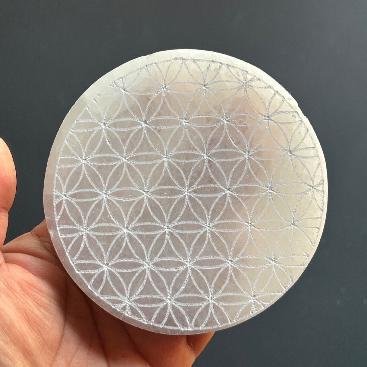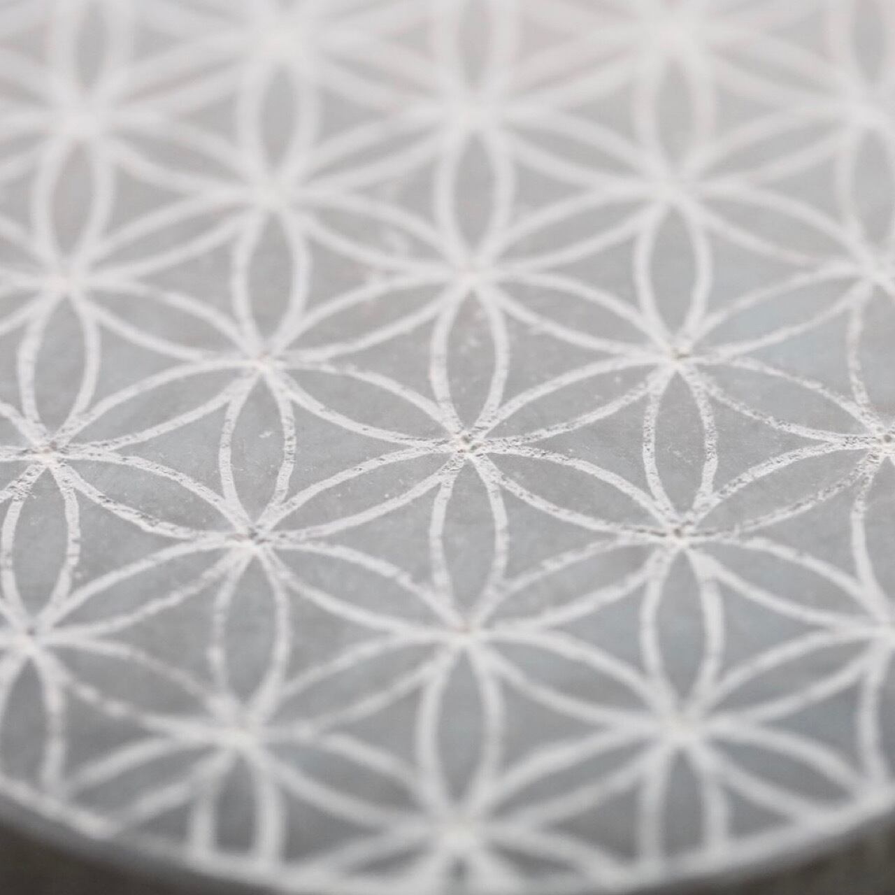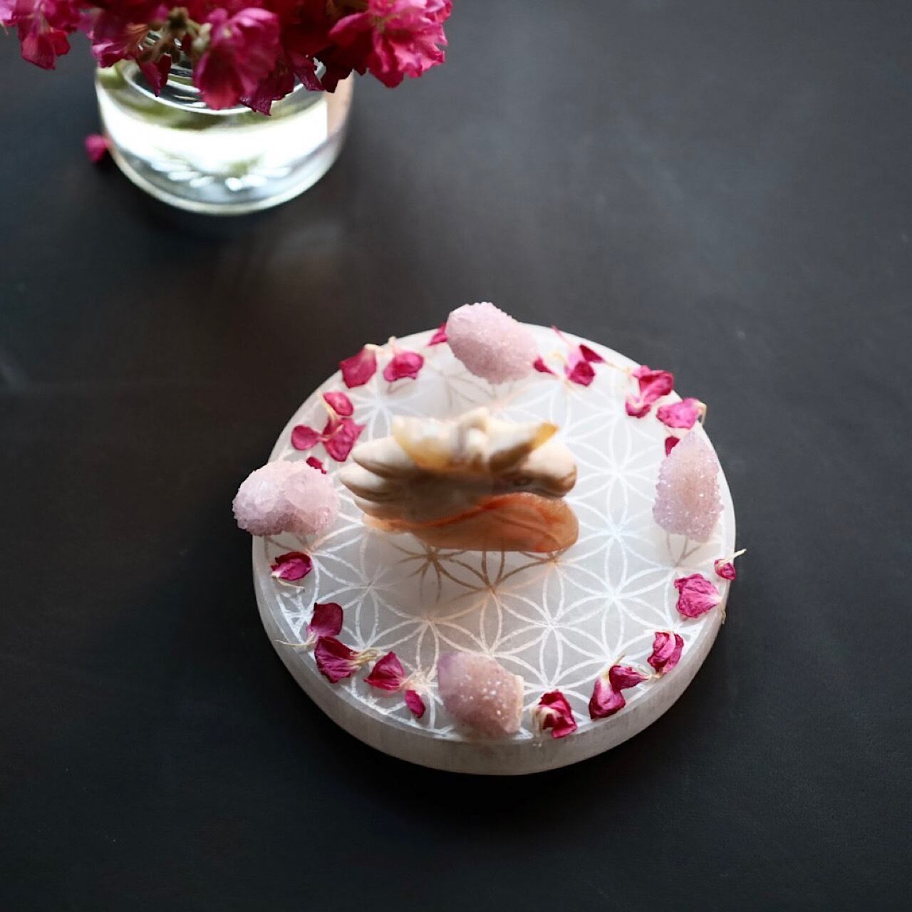 また、この高い波動のセレナイトに神聖幾何学であるフラワーオブライフ※の彫刻が施してありますので、グリッドに小さな石や花びらを並べたり、アクセサリーや天然石の浄化やエネルギーチャージにもお使いいただけます(参考例:画像7〜9枚目)。
