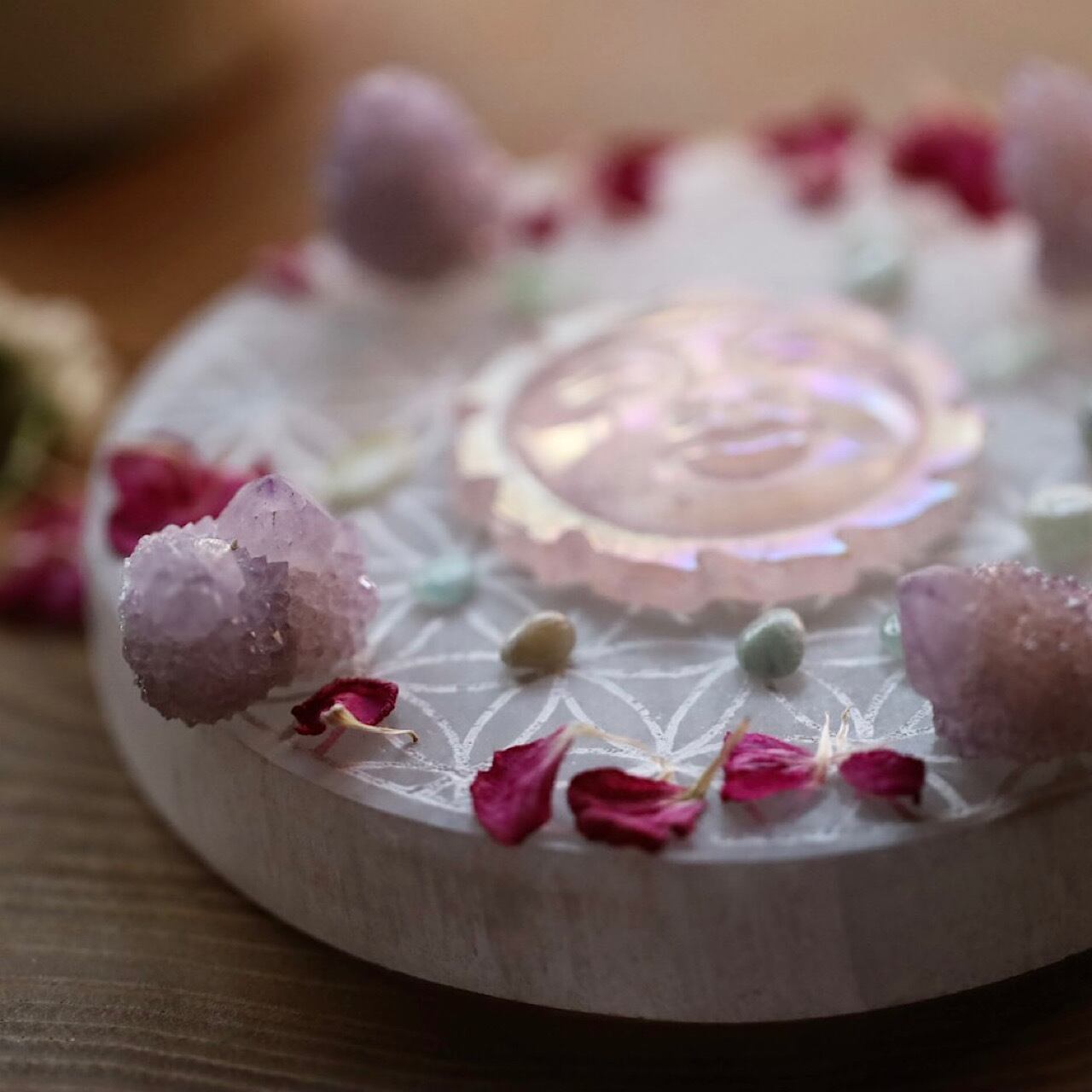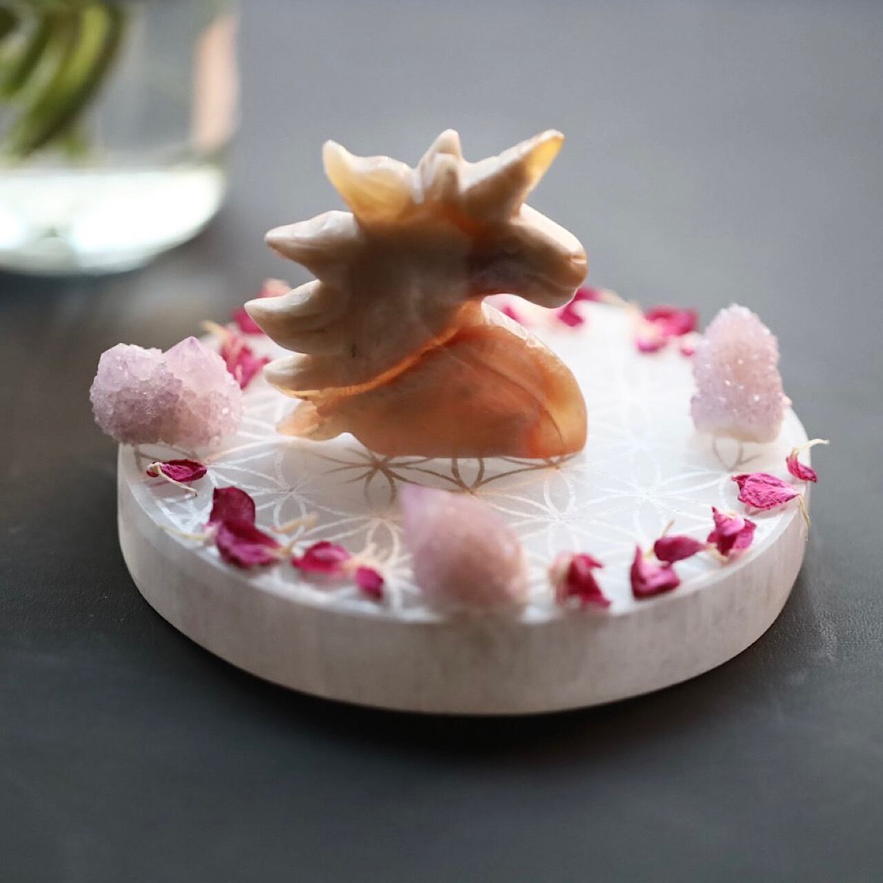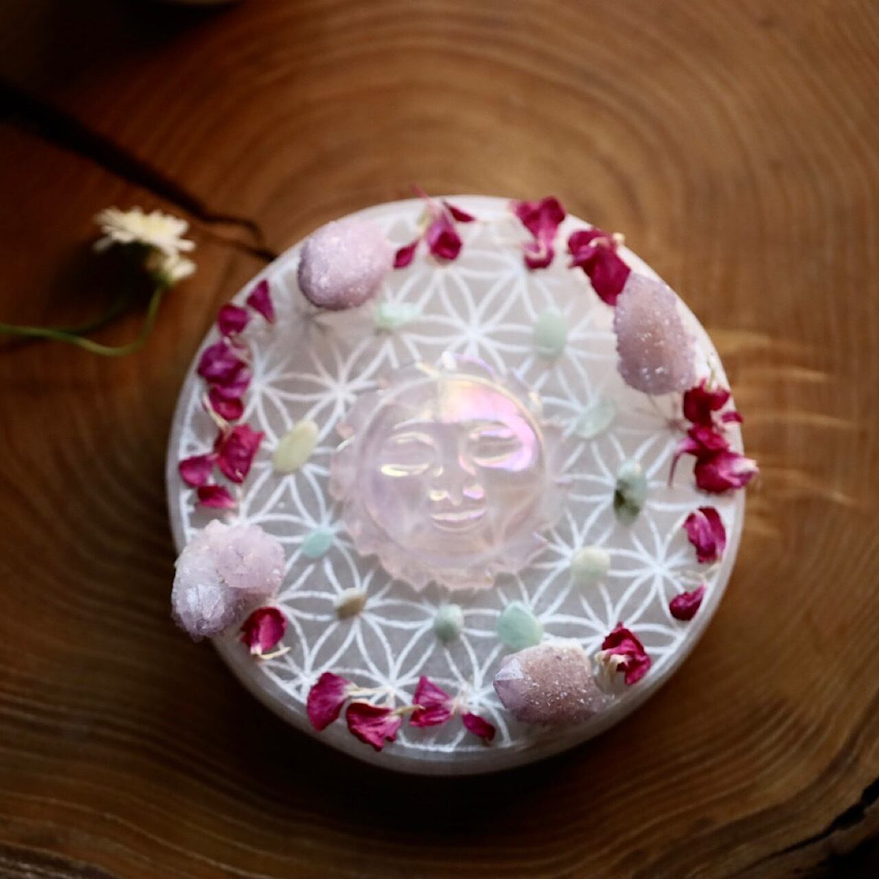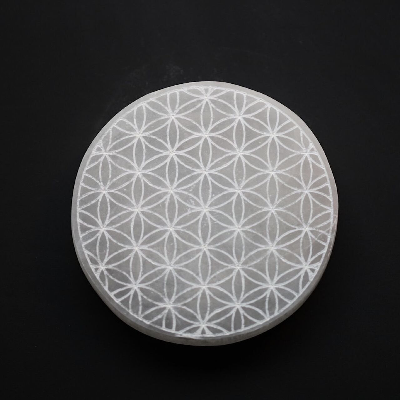 また、この高い波動のセレナイトに神聖幾何学であるフラワーオブライフ※の彫刻が施してありますので、グリッドに小さな石や花びらを並べたり、アクセサリーや天然石の浄化やエネルギーチャージにもお使いいただけます(参考例:画像7〜9枚目)。